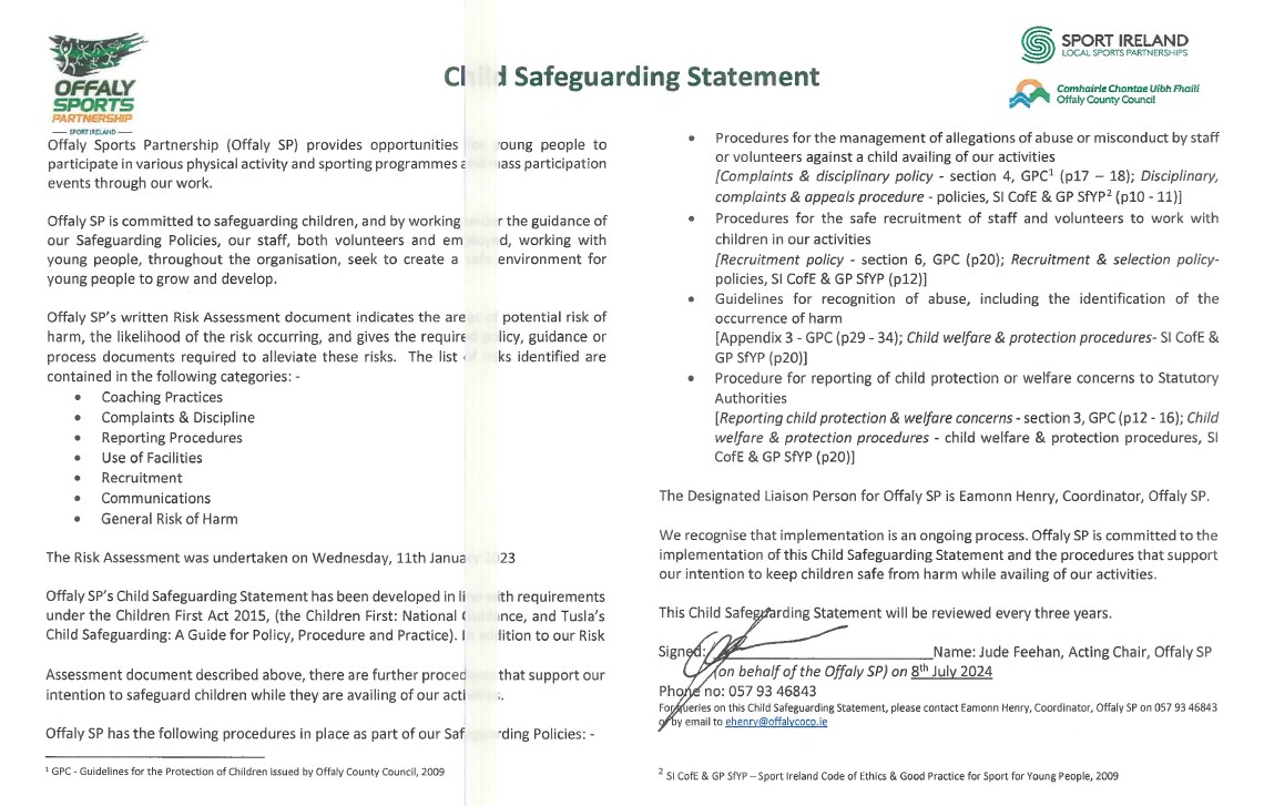See Offaly Sports Partnership's Child Safeguarding Statement below. A copy of the child safeguarding statement risk assessment can be requested by contacting sports@offalycoco.ie