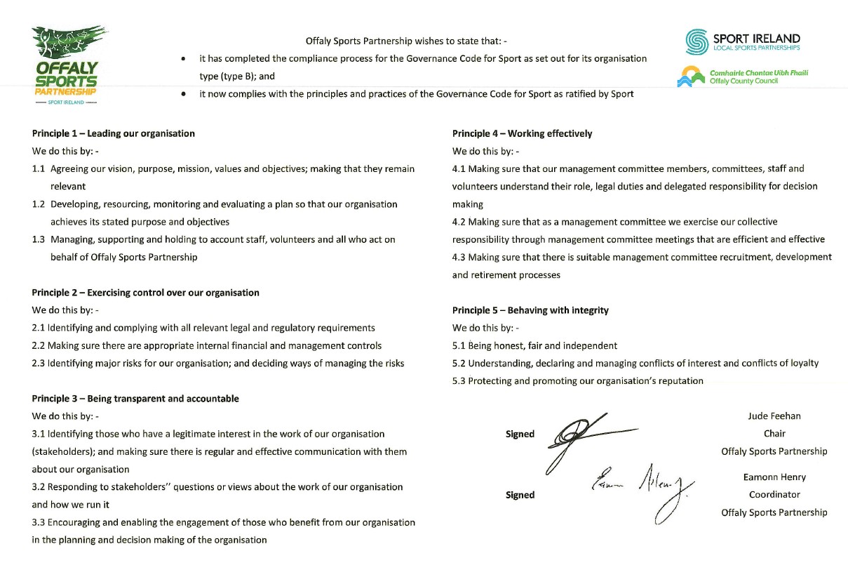 See Offaly Sports Partnership's Public Statement of Compliance with the Governance Code for Sport below.