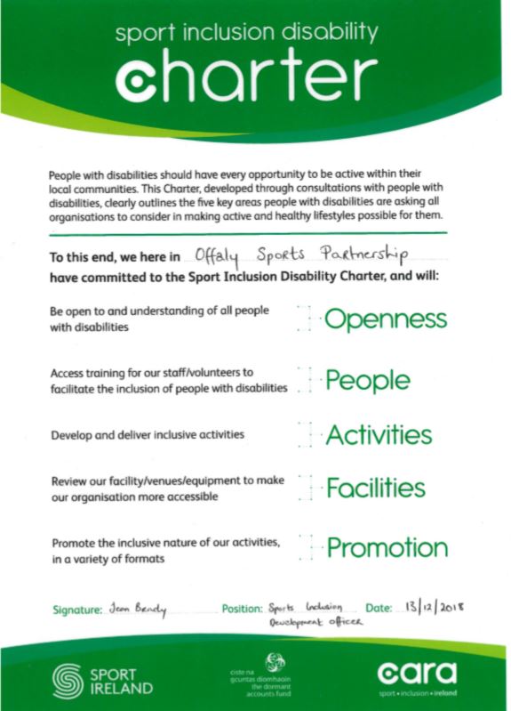 Offaly Sports Partnership have committed to the Sports Inclusion Disability Charter as outlined below.
