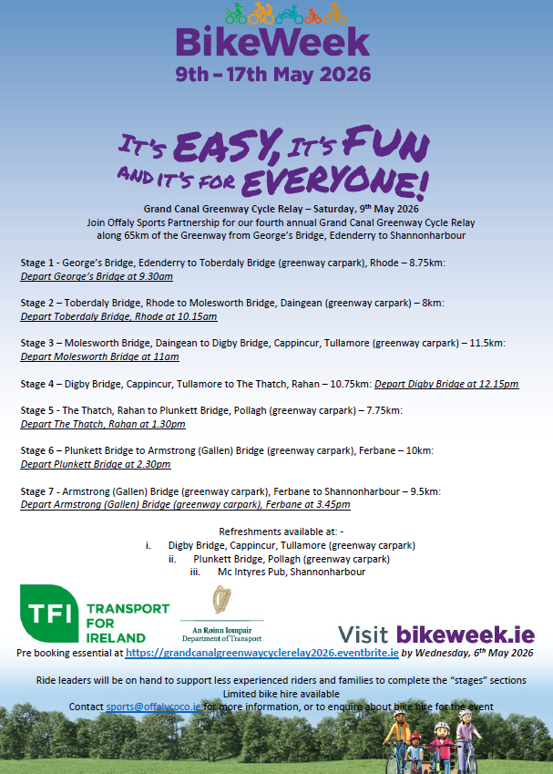 Pre booking essential at https://grandcanalgreenwaycyclerelay2026.eventbrite.ie by Wednesday, 6th May 2026