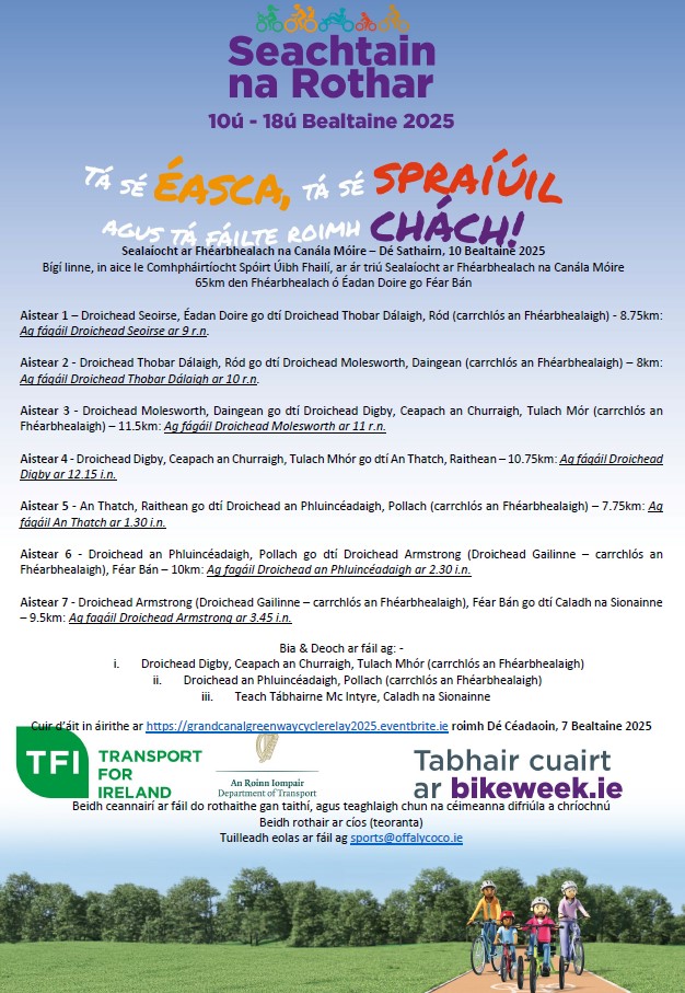 Pre book your place here, https://grandcanalgreenwaycyclerelay2025.eventbrite.ie by Wednesday 7th May 2025