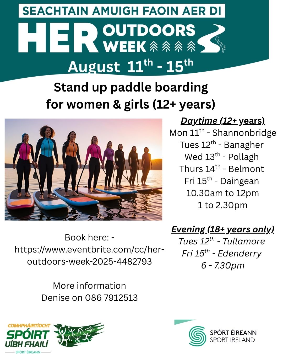 Seaschéaslóireacht le mná & cailíní (12+ bliana d'aois) ó 11ú go dtí 15ú Lúnasa / Stand up paddleboarding for women & girls (12+ years) from 11th to 15th August