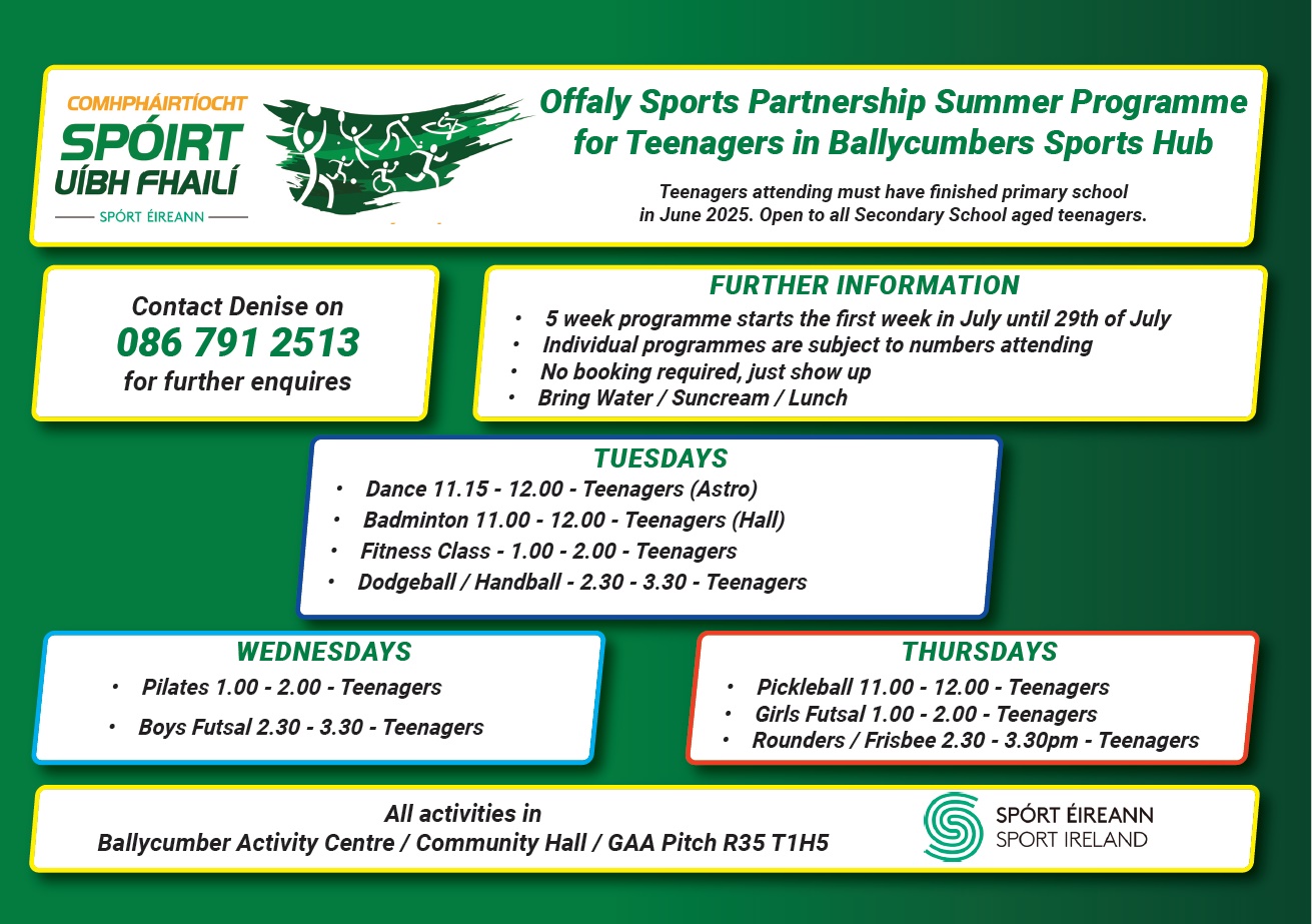 Summer programme for teens every Tuesday to Thursday from 11am to 4pm in Ballycumber Sports Hub. Check out the activities overleaf.