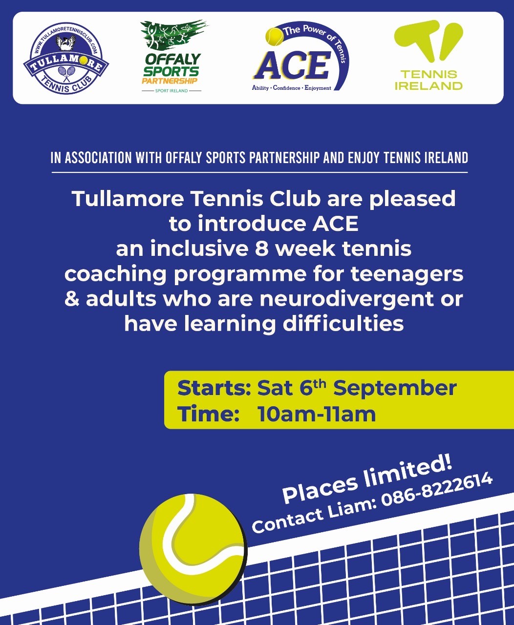 Tullamore Tennis Club are pleased to introduce ACE, an eight week tennis coaching programme (one hour per week - 10am to 11am on Saturdays from 6th September) for teens and adults who are neurodivergent or have learning difficulties
