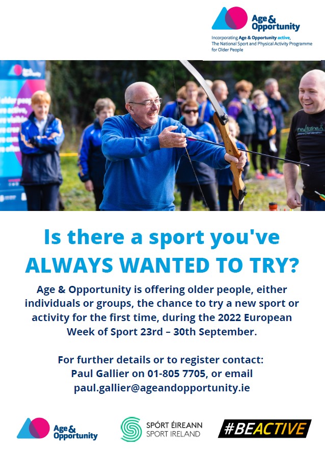 As part of the European Week of Sport 2022 taking place from 23rd to 30th September 2022, Age & Opportunity Active are once again offering individuals and groups to chance to try a new sport or activity for the first time