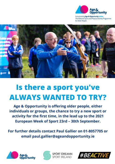 Age & Opportunity’s Active programme is offering individuals and groups the chance to try a new sport for the first time in the lead up to and including the European Week of Sport which runs from the 23rd – 30th September 2021.
