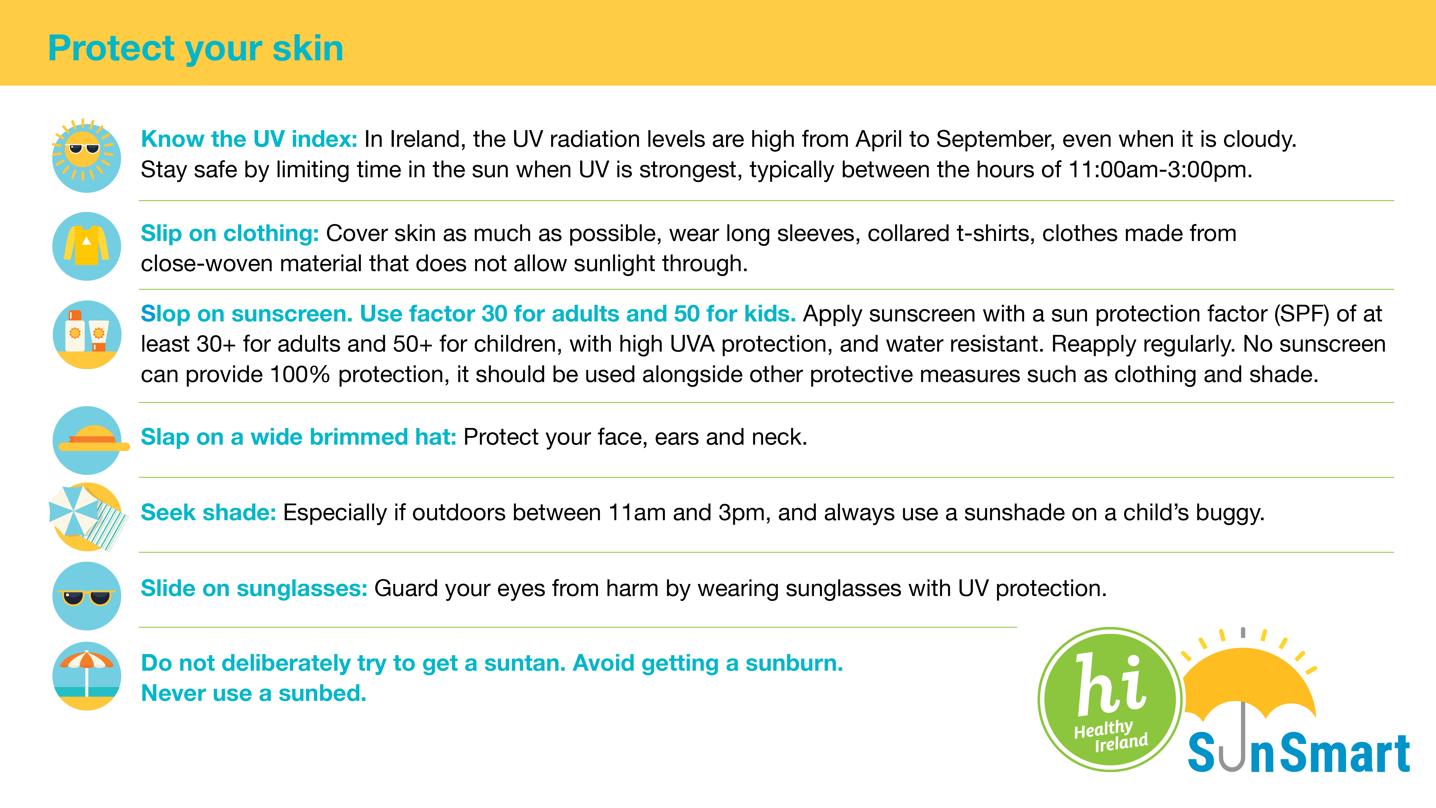 This campaign, lead by the HSE, will focus on skin cancer prevention, by promoting simple key messages to encourage people to enjoy the sun safely, and make skin protection part of their everyday routine. The campaign is supported by Healthy Ireland and the Irish Cancer Prevention Network.