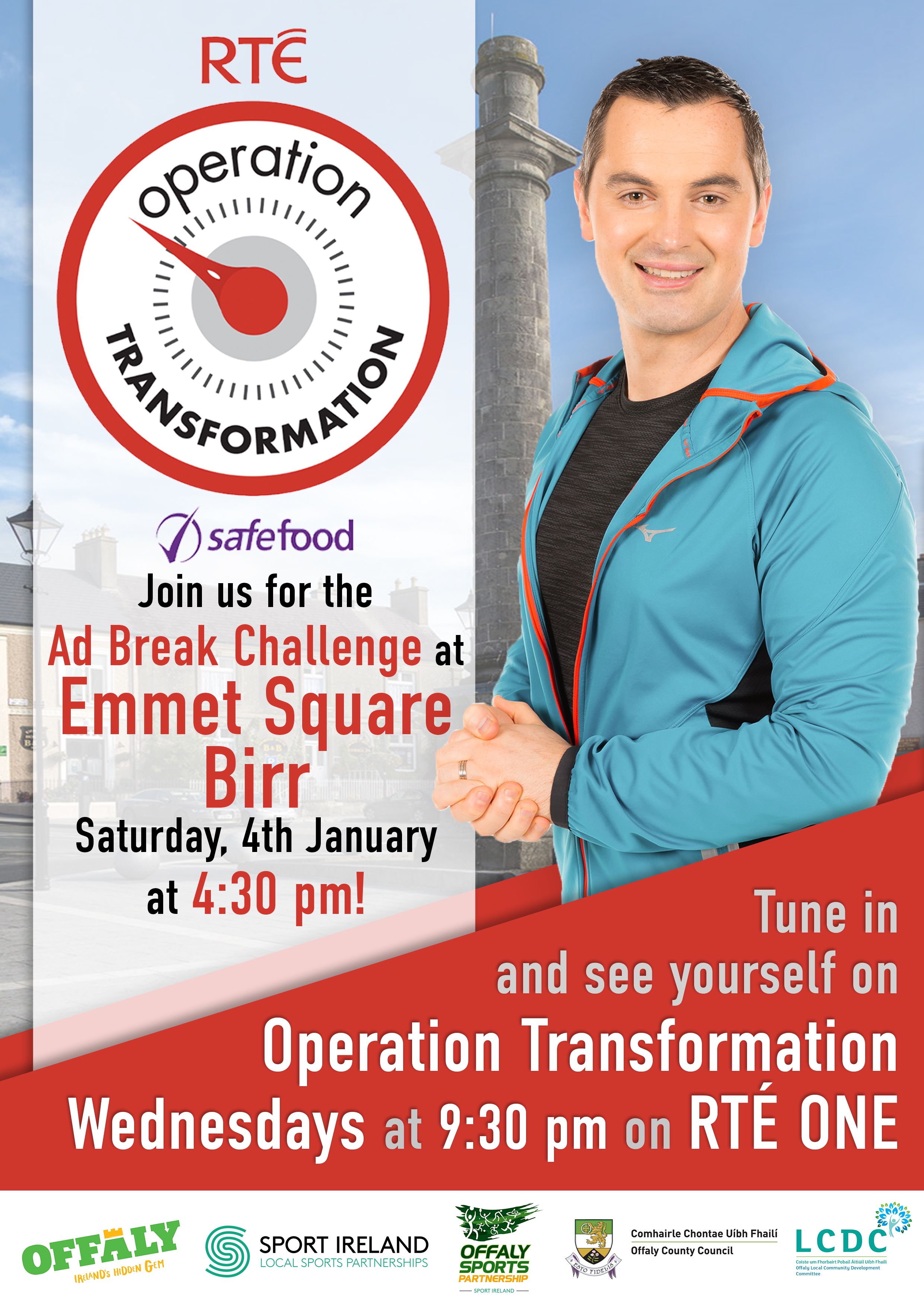 Our first Ad Break Challenge will be filmed in Emmett Square Birr, on Saturday 4th January at 4.30pm. We want as many people as possible to join us and kick start the new year with Operation Transformation.