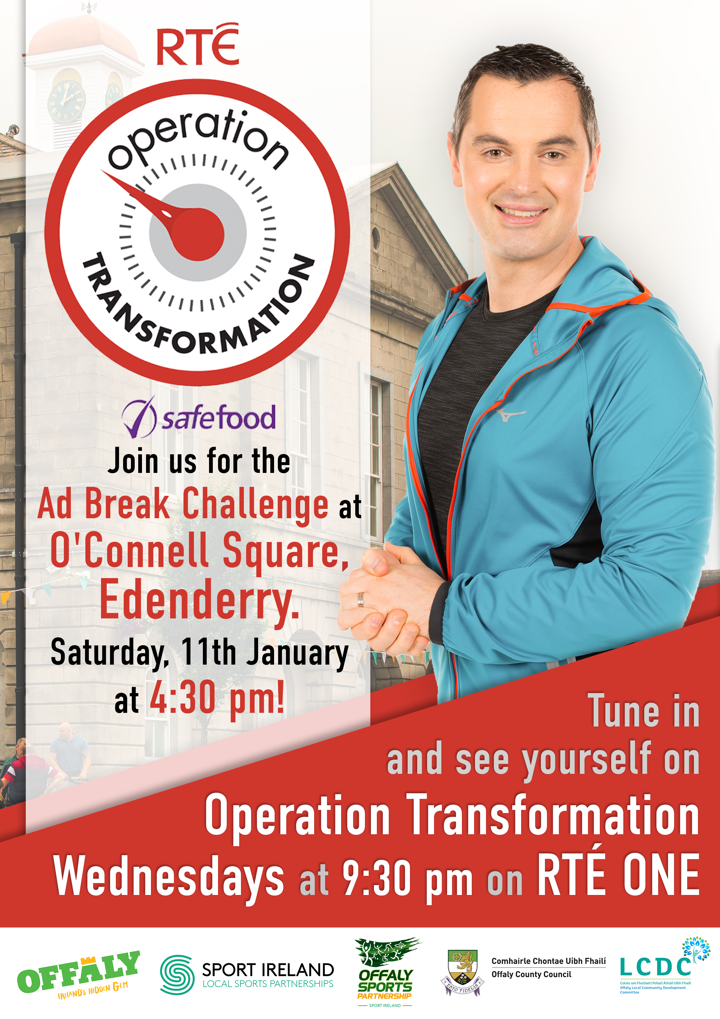 Our second Ad Break Challenge will be filmed in O Connell Square, Edenderry on Saturday 11th January at 4.30pm. We want as many people as possible to join us and kick start the new year with Operation Transformation