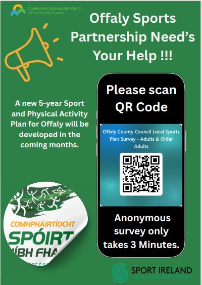 A new 5-year Sport and Physical Activity Plan for Offaly will be developed in the coming months. We need your help to inform this plan through our quick and easy online survey.