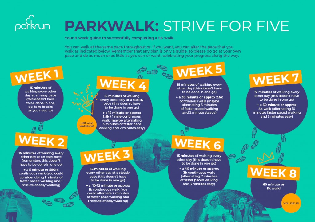 Week six - 15 minutes of walking every other day (this doesn’t have to be done in one go). Add a 40 minute or approx 3k continuous walk (alternating 7 minutes of faster paced walking and 3 minutes easy) once a week.